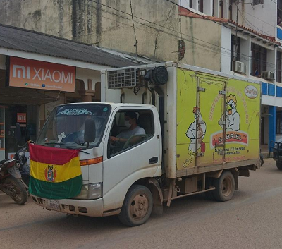 Residents in the city watched the chicken truck’s arrival with interest and put the Bolivian flag onto it when it left the airport.