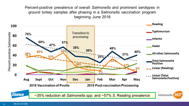 In 2018, Elanco partnered with a turkey producer to study the efficacy of Salmonella vaccines by assessing ground turkey samples for the presence of Salmonella, including S. Reading. The study involved evaluating Salmonella presence in ground turkey samples before and after a vaccination program began.