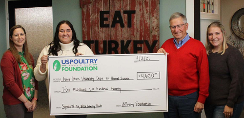 The USPOULTRY Foundation awarded a $4,620 student recruiting grant to Iowa State University. The grant was made possible in part by an endowing Foundation gift from West Liberty Foods. The check was presented by West Liberty Foods Chairman and USPOULTRY Board Member Paul Hill to Iowa State Department of Animal Science Assistant Professor Dawn Koltes and Student and Poultry Interest Group President Katelyn Boeding. Joining in the presentation was Iowa Turkey Federation Director of Communications Morgan Minnehan.